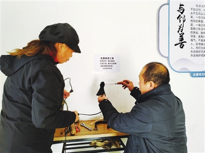 张睿玲很支持,当即搬来桌子,并在墙上贴了温馨提示:“免费维修工具,使用完毕,物归原处……有难题找老张。”很快,有人来借工具。乔女士拿来有故障的台灯,请他帮忙维修。老张乐呵呵地接过,检查了一遍线路,马上就弄好。陈大娘家的椅子摇晃不稳,他立即上门,敲敲打打,修复如新。