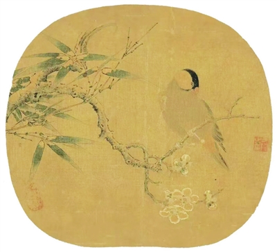 此图是团扇形式。团扇在中国画创作上属于小品,正因为其画幅小,在内容上必须加以精练。此图主要表现老梅、寒莺与竹叶。章法严谨,继承了折枝花构图的特点。梅花一枝横出,用笔老辣苍劲,穿插交互、自然生动,盛开的梅花与花蕾依枝而附。竹叶的疏密交织与梅花呼应。图中之禽乃莺,虽是寒冬,但它体态丰满,神情怡然。梅、竹、莺三者的组合,构成富有审美意蕴的画面。