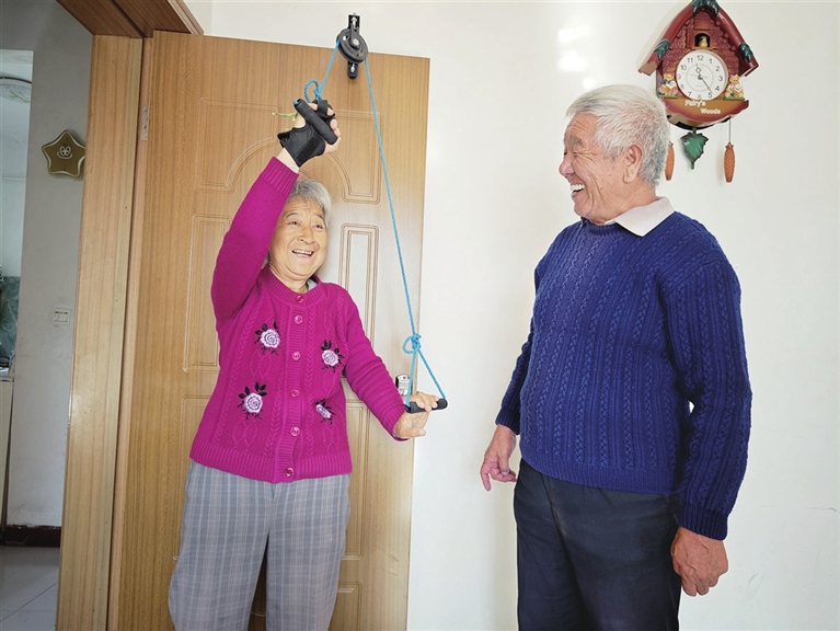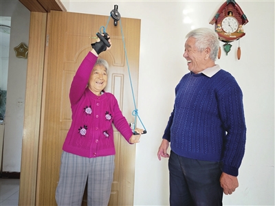 王耀堂咨询医生后,为妻子制订了详细的康复计划,每天陪她锻炼。他买来专用的拉伸带,让妻子练习胳膊。用自行车的轮子,改造成练腿的器械。