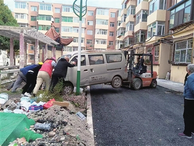 隔壁小区正在实施改造,有施工设备。网格员找到施工负责人,说明情况。对方派来几名工人和叉车,帮忙将这辆车运走。随后,社区人员又清理了周边垃圾,这片区域的面貌焕然一新。不少居民见了,高兴地说:“这下敞亮了,出行也顺畅了。”