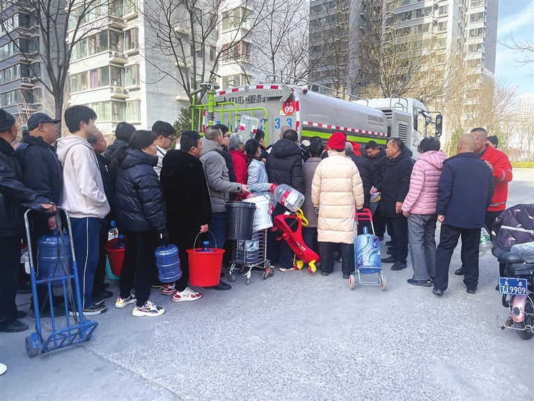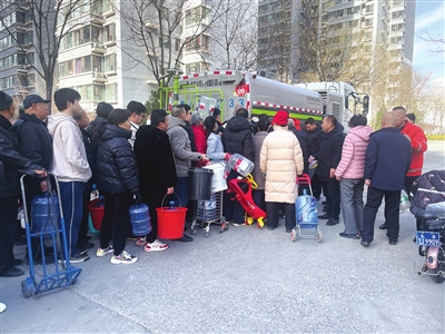 由于小区居民较多,又恰逢午间做饭时段,供水部门派来送水车,全力满足大家的生活用水需求。“大家排好队,一个一个来,别急。”居民们拎着桶、拿着盆,排队有序取水。对于腿脚不便的独居、空巢老人,社区组织网格员们送水上门。