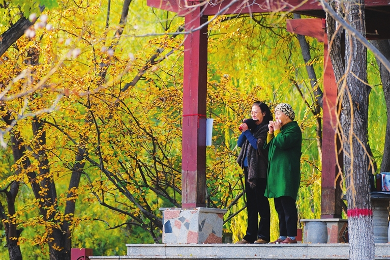 12月1日,游人在学府公园吹着口琴,享受冬日的暖阳,感受生活的美好。