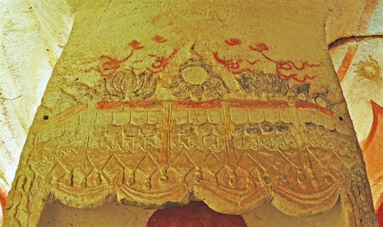 天龙山第8窟中心塔柱上面的雕刻内容异常丰富,非独中原文化因素。其中心塔柱四壁横枋上正中雕饰莲瓣托火焰宝珠,两侧为仰莲、火焰宝珠、山花蕉叶相间;东壁横枋壁面雕饰连珠纹;中心塔柱东壁佛像左手置于左腿上,掌心向下,手捏大衣衣角,右手置于左足上,掌心向上;南壁左侧弟子左手下垂,执一长颈净瓶等,这些都是中西文化交流之后出现的纹饰,甚至就连中心塔柱本身,都是外来文化因素影响的结果。笔者在莫高窟考察时多次发现,这里的许多隋代洞窟佛塑像上都有丰富多彩的连珠纹,亦有许多左手执净瓶的菩萨塑像,追本溯源,这些元素均来源于波斯和印度。横枋上的火焰宝珠、山花蕉叶更是中西文化交流的产物。这些都足以证明,隋代太原地区也是丝绸之路东西交流的一个核心地带,如果拿此窟与太原虞弘墓出土的相关文物——石棺石椁的祆教元素来比较,虽然文物品类不同,但文化元素、文化内容均为外来。可以说,二者无疑都是隋代太原地区中西文化交流的重要代表性器物。十六国北朝时期,粟特等相关胡商、胡僧往来不绝,多数在晋阳地区扎根繁衍生息,一并带来了他们的信仰和习俗,这些文化元素,那时就已经融进了中华民族的血液,相互影响之后,最终在第8窟的中心塔柱雕像上得以完美体现,给我们带来艺术的震撼。
