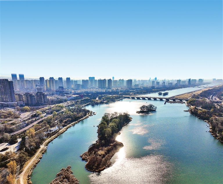 12月2日,初冬的汾河湿地公园,湛蓝如碧的河面与金黄的芦苇构成了一幅美丽的画卷。张昊宇 摄