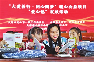 12月5日,市关心下一代工作委员会、市关爱下一代志愿者协会联合举办的“爱心包”捐赠活动在小店街道李家庄小学举行,为该校50名儿童送上棉衣、学习用品等。图为志愿者给孩子们讲故事。