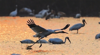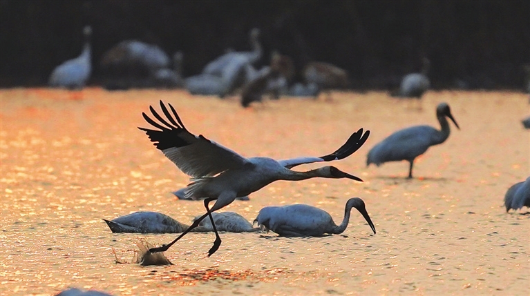 时值初冬,江西鄱阳湖区迎来大批越冬候鸟。在南昌高新区五星白鹤保护小区,成群的白鹤、天鹅等候鸟与落日余晖交错,美不胜收。