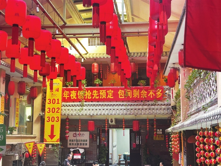 位于胜利街兵工南马路的老井抿尖村,主打山西特色菜,定位为中档消费。工作人员告诉记者,餐厅的包间数量不多,初一到初五的包间均已订满,仅剩大厅有少量空余散台,整体预订率达80%以上。“为了能预订上年夜饭,不少消费者‘下手’很早。餐厅推出的年夜饭套餐按照每8到10人位制定,价格在1000多元,允许顾客自带酒水。”