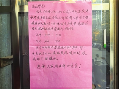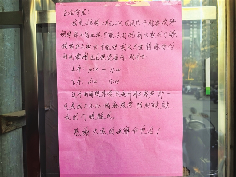 “我是16号楼的住户,平时喜欢弹钢琴来丰富生活,提前和大家打个招呼,我会尽量将练琴的时间控制在合理范围内……这个时间段外,您还是听到了琴声,那一定是我不小心。麻烦您随时敲门提醒,感谢大家的理解和包容。”安宁街89号院,玉园南社区网格员胡佩佩经过楼宇门时,被这样一张纸条吸引。