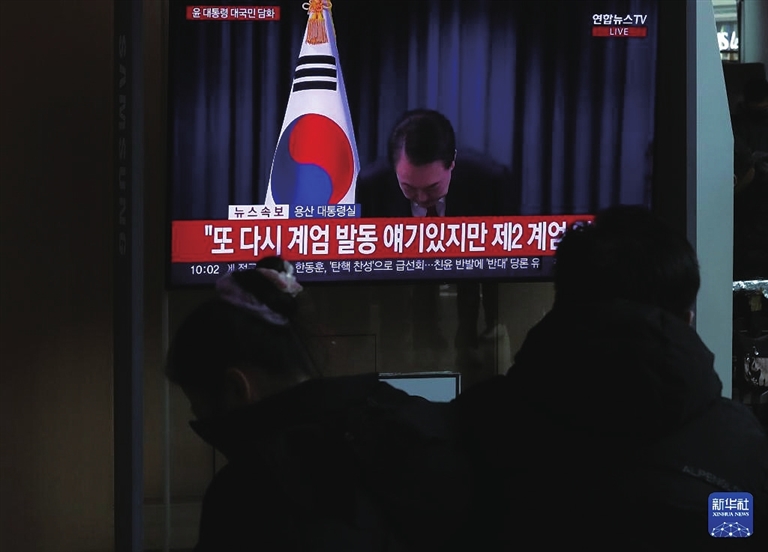 12月7日,在韩国首尔火车站,民众观看总统尹锡悦发表讲话的电视画面。