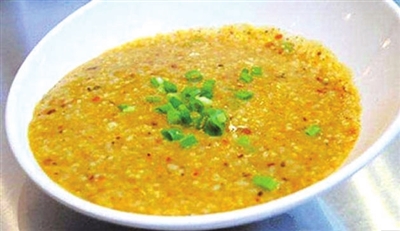 我吃起了酸粥。果然,那酸粥酸溜溜的,酸里还透着一股甜香,如醇香的酸奶,透着黄米的清香;酸粥里还有几块土豆、南瓜和绿豆,嚼起来特别筋道,软粥配上筋道的土豆、南瓜,真是一碗美味的酸粥!