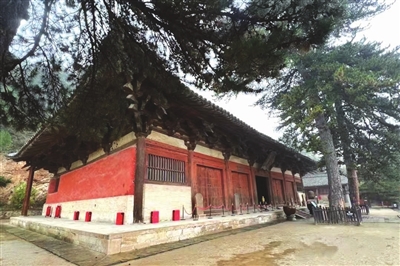 步行至山门处,我们并未急于入寺,仿佛是来拜访一位德高望重的老者,在入门前,要先整理衣着、平复心情。寺前空旷处,参天古木、红墙逶迤、云气缭绕,远眺山腰处无法藏掖于翠柏中的东大殿檐角,原本已经平复的心跳,再起惊涛。