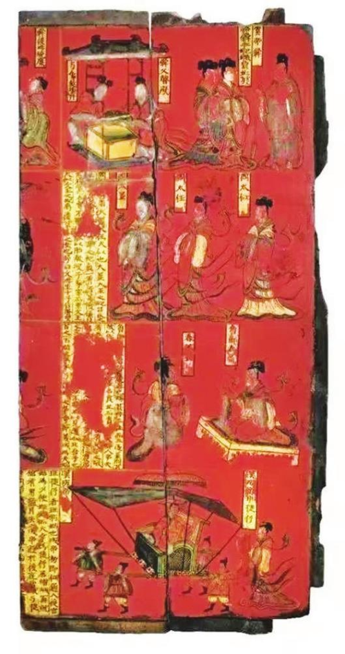 木板漆画,是与石床榻一起组合使用的围屏构件,为木胎漆绘,木胎外以麻布为底,再以漆填平。屏风板正、背面均绘漆画,画面自上而下分为四层,呈现列女古贤人物故事,人物旁多有榜题和题记。故事和文字内容取材于《列女传》《孝子经》《汉书·外戚传》等史籍文献。四幅图画内容如下: