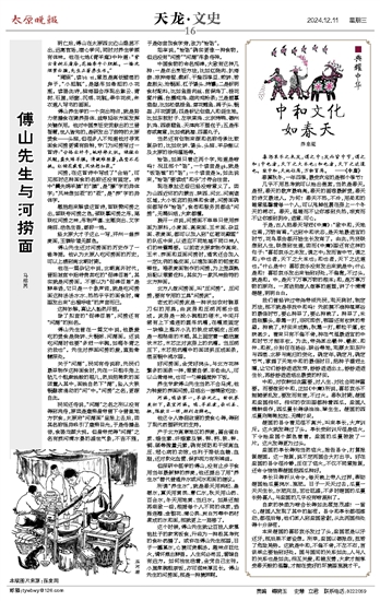 这个时候,傅山先生就让百姓人家填饱肚子的家常饭食,升级为一种极其考究的食补药膳了。或许在傅山先生那里,日子一罐寡水,心境可煲靓汤。趣味点旺灶火,情怀煨出鲜香。人生何必苟且,箸端自有远方。如何浊世活着,全凭自己主张。小屋笨碗粗茶饭,亦可滋味厚且长。傅山先生的河捞面,那是一种境界啊。