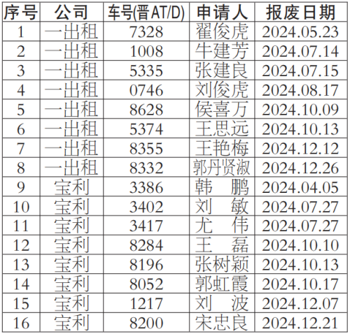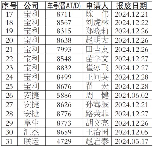 按照《太原市客运出租汽车服务管理条例》等有关规定,现对提出车辆更新申请的巡游出租汽车经营者申报材料进行核实,对符合条件的经营者名单31人予以公示,公示期为2024年12月13日-2024年12月17日,公示期结束无异议的,按车辆报废先后顺序办理车辆更新手续。
