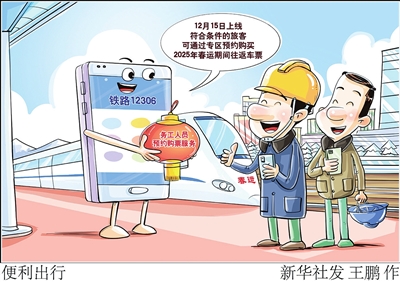 铁路12306科创中心相关负责人介绍,2024年12月15日至2025年2月7日,已通过实名制核验的务工人员可在铁路12306手机客户端“务工人员春运预约购票服务”专区,预约购买2024年12月31日至2025年2月23日的火车票,同一账户最多可同时提交3个订单,每个订单可添加1个乘车日期的5个“车次+席别”的组合,最多可为包含本人在内的9名旅客预约。