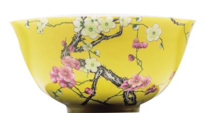 而另一件故宫博物院收藏品:清雍正黄地珐琅彩梅花纹碗,则以其色彩鲜艳、光泽细腻著称。
