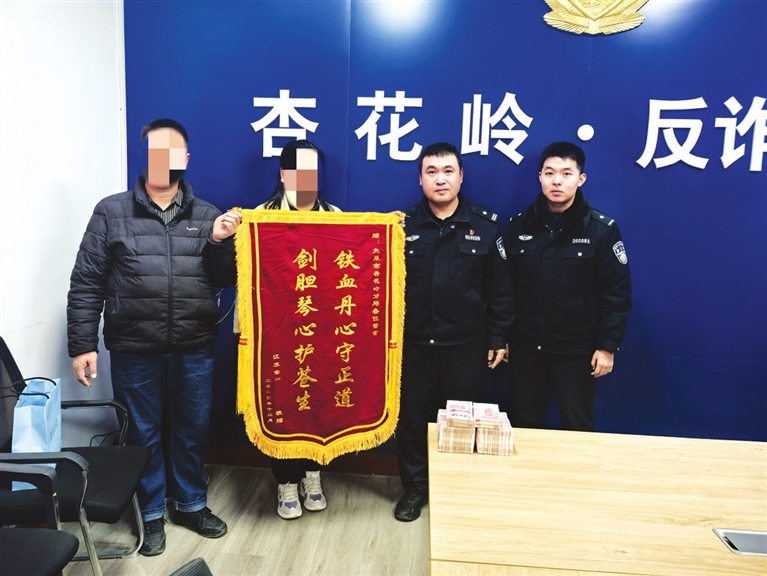 12月10日,张先生从江苏常州来到太原,带着一面印有“铁血丹心守正道 剑胆琴心护苍生”的锦旗走进公安杏花岭分局反诈中心,领回了沉甸甸的24万元现金。