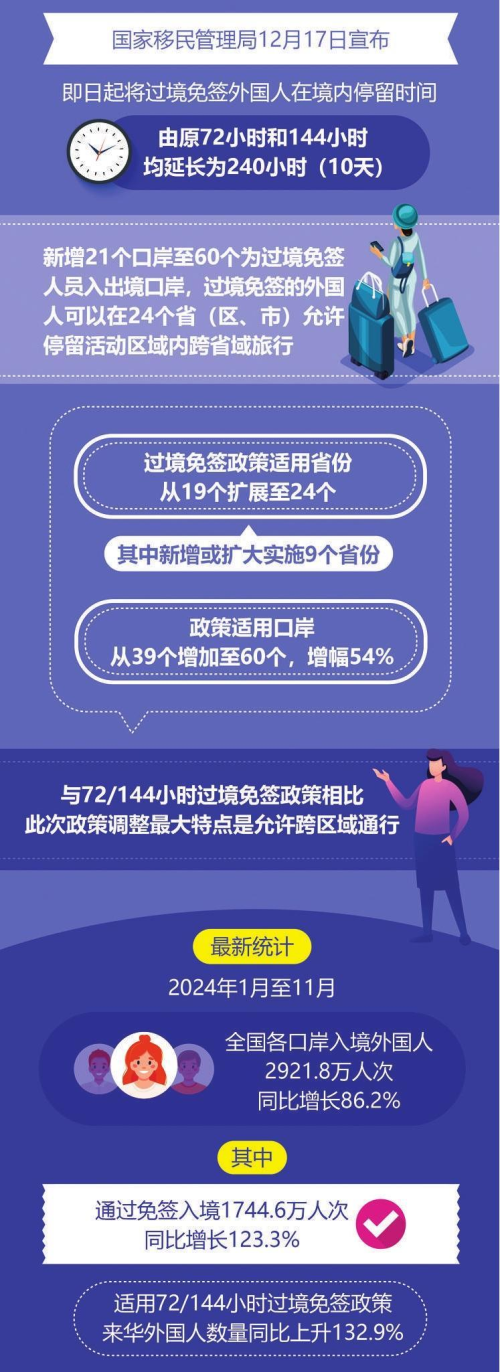 国家移民管理局12月17日宣布,即日起将过境免签外国人在境内停留时间由原72小时和144小时均延长为240小时(10天),新增21个口岸至60个为过境免签人员入出境口岸,过境免签的外国人可以在24个省(区、市)允许停留活动区域内跨省域旅行。