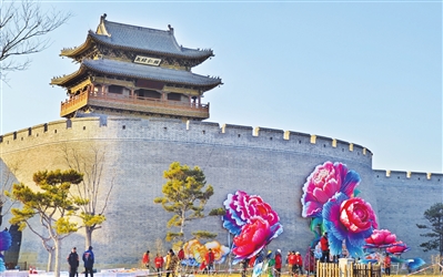 12月18日,太原古县城东门外,工人正在安装花灯,为新春灯展作准备,营造节日氛围。