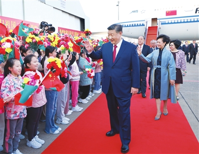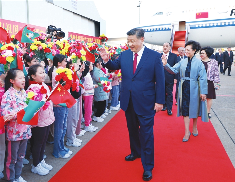 16时许,习近平乘坐的专机徐徐降落在澳门国际机场。习近平和夫人彭丽媛走出舱门,向欢迎人群挥手致意。澳门警察乐队奏响热情洋溢的欢迎曲,舞龙舞狮表演喜气欢腾。舷梯旁,两名少年儿童向习近平和彭丽媛献上鲜花。在澳门特别行政区行政长官贺一诚和夫人郑素贞陪同下,习近平和彭丽媛同前来迎接的人员亲切握手。数百名澳门青少年和各界群众代表挥动国旗、特别行政区区旗和鲜花,表达热烈的欢迎。