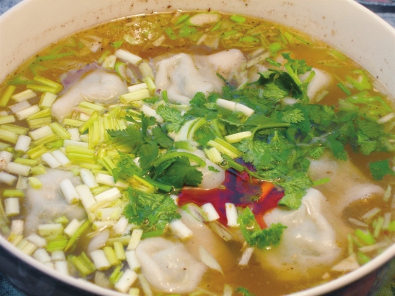 饺子煮好了,先把一大勺饺子汤浇入调制好的汤碗内,再连汤和饺子一起盛入碗中,喜欢吃辣的人还可以加一点辣椒油,一大碗酸汤饺子就做好了。这碗带汤的饺子不光味道好,碗里的颜色红、黄、绿、白,赏心悦目。