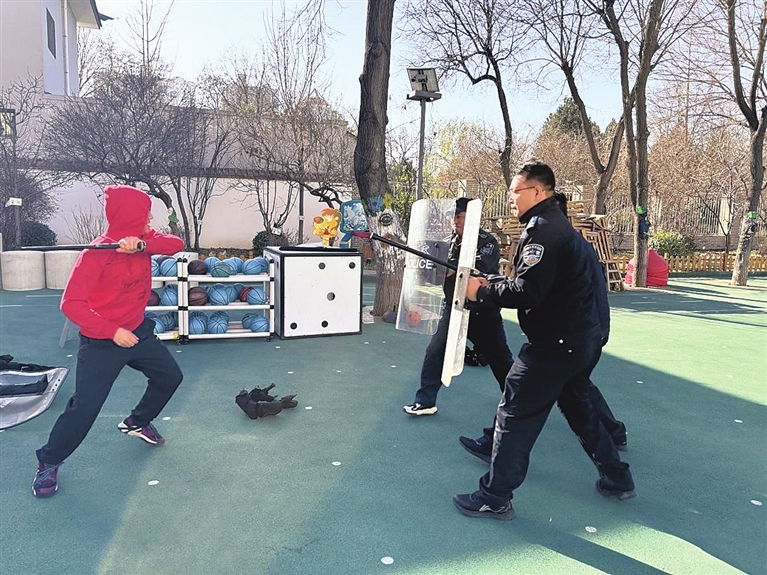 十二月二十三日,老军营派出所民警在育才幼儿园组织校园安全演练,通过模拟突发事件场景,提升校园安保人员反恐防范意识和应对处置突发事件的能力。 辛欣 摄