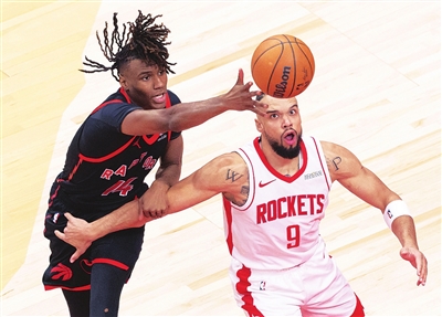 12月22日,猛龙队球员沃尔特(左)与火箭队球员布鲁克斯在比赛中拼抢。当日,在2024-2025赛季NBA常规赛中,多伦多猛龙队主场110比114不敌休斯顿火箭队。 新华社 发