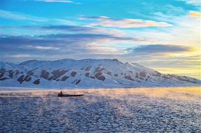 赛里木湖是新疆海拔最高、面积最大的高山湖泊。冬至后,湖区气温可降至零下20摄氏度,湖面结冰,形成独特的“冰馕”景观。