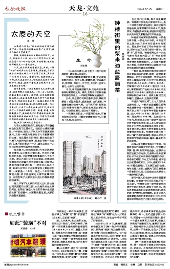 茶在中国人的生活中占有极其重要的位置。有道是“宁可三日无食,不可一日无茶”。钟楼街上有一家专营茶叶的老字号名为乾和祥,始创于1918年。乾和祥最负盛名的应该是茉莉花茶,茶汤明澈,香气鲜锐,滋味醇厚。好多太原人是喝着乾和祥的茉莉花茶长大的,它的香味牢牢地刻在了太原人的记忆深处。