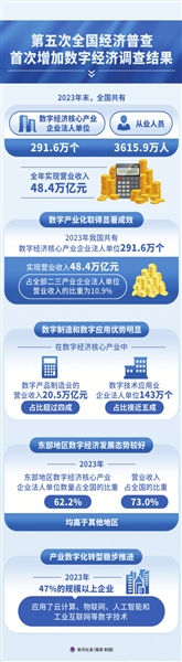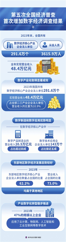 第五次全国经济普查首次增加数字经济发展状况相关内容。数据显示,2023年末,全国共有数字经济核心产业企业法人单位291.6万个,实现营业收入48.4万亿元,占全部第二三产业企业法人单位营业收入的比重为10.9%。