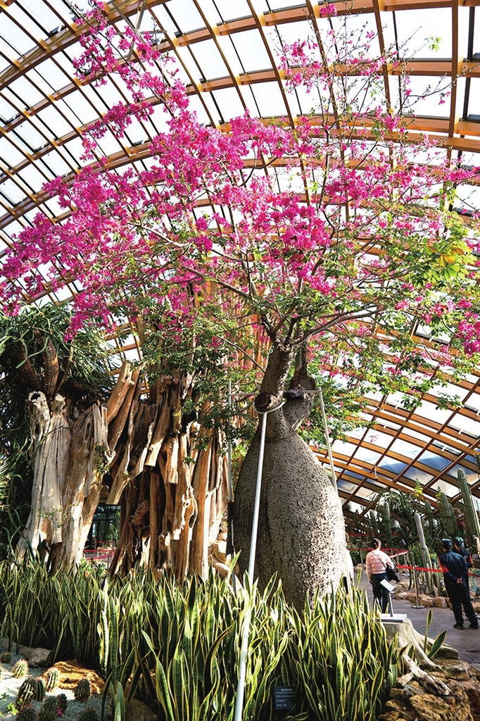 据了解,大腹木棉为落叶大乔木,高10米至15米,树干下部膨大,冬季为开花期。树冠伞形,叶色青翠,成年树树干呈酒瓶状;冬季盛花期满树姹紫,秀色照人,是行道树、庭院绿化美化的高级树种。