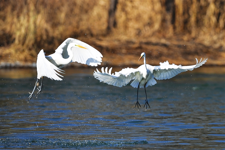 1月2日,汾河景区湿地公园,白鹭在争抢觅食,一派生机勃勃的景象。近年来,随着我市汾河生态环境和水质的不断改善,汾河太原段流域内的野生鸟类数量和种类不断增多。