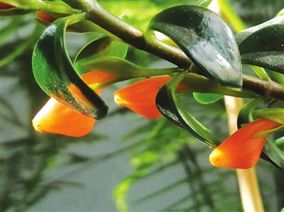当天,刘大娘惊喜地发现,金色的“小金鱼”纷纷张开了“小嘴”,“小嘴”周围环绕着5个红红的星点,在金色暖阳照射下,仿若一尾尾美丽的“小金鱼”在满盆浓绿的小小叶片间穿梭嬉戏。刘大娘指着浓绿厚实的椭圆形小叶片让记者细细观察,原来,在叶片背面紧挨叶梗处,还呈现出绚烂的暗红色锦斑。刘大娘兴致勃勃地介绍说,金鱼吊兰特别喜欢冷凉季节,花期一般都在冬春季节,现在很多人把它当作年宵花养在家里,非常符合中国传统的“年年有鱼”这个美好寓意。