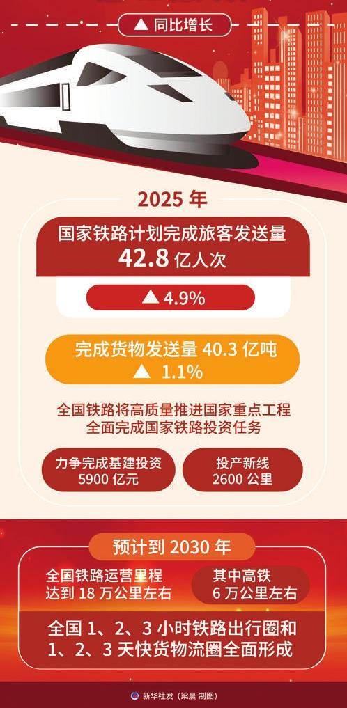 【2025】国家铁路计划完成旅客发送量42.8亿人次,同比增长4.9%;完成货物发送量40.3亿吨,同比增长1.1%。