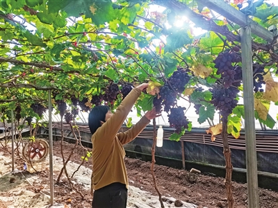 1月5日,在清徐县西怀远村,晶莹剔透的雪蜜葡萄挂满了枝头,陆续成熟。该村的葡萄大棚采用延迟栽培种植技术,延长了葡萄的供应周期,为冬季鲜果市场送上别样甘甜。 孙佳敏 李志东 摄影报道