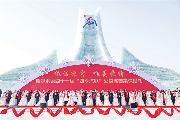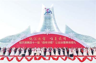 当日,作为哈尔滨国际冰雪节重点活动之一的哈尔滨第四十一届“四季沐歌”公益冰雪集体婚礼在哈尔滨冰雪大世界举行,来自全国17个省(区市)的43对新人在冰雪中喜结良缘。