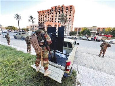 1月5日,士兵在利比亚西部沿海城市扎维耶执勤维持治安。