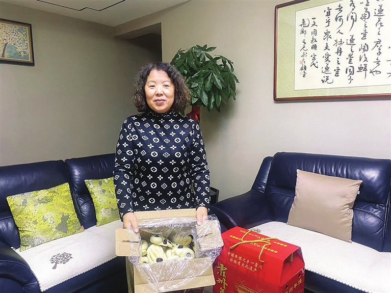 1月8日当天,御德苑社区网格员张丽红在小区走访时,见王女士拎了不少东西,赶忙过去帮忙。王女士高兴地说:“小郭回家过年了,这是她特意寄来的,让我这个‘家人’也尝一尝。”