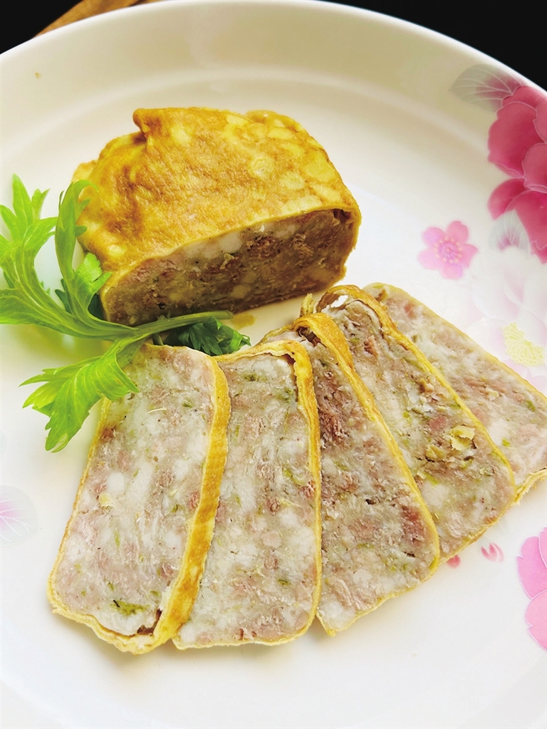 蛋皮做好后,平铺在菜板上,上面放适量的肉馅,轻轻卷成矿泉水瓶粗细的柱状,上笼大火蒸1小时。蒸制的时间可以视卷卷的粗细和数量酌情增减。卷卷出笼后,整齐地排放在案板上,上面再摆一个案板,置重物压制。半小时后,取下案板,晾凉切片即可。压制后的卷卷不仅形状好看,也更加紧实,切片时不容易散落。