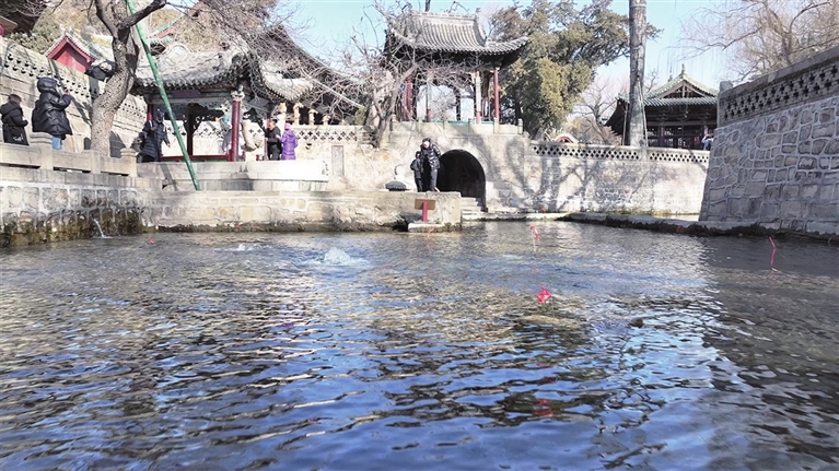 难老泉水倾泻而出,水花飞溅,似银链跳动。泉水欢快流淌,鱼儿灵动地穿梭于水草间。潭中央的4个泉眼中,泉水“突突”地向外喷涌,在阳光下闪着晶莹的光芒,形成视觉奇观。