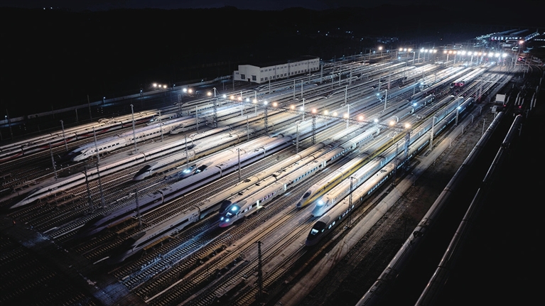 1月13日凌晨,完成检修的动车组列车停靠在贵阳北动车所内(无人机照片)。