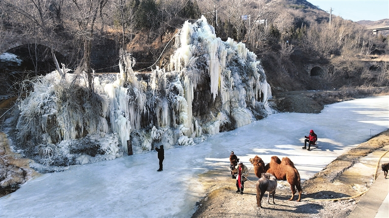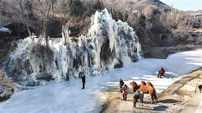 1月16日,游客们在晋源区店头村冰瀑前滑冰赏景。每年冬季,该村人造冰瀑景观吸引了众多游客前来感受古村魅力。