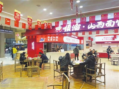 大厅里支起了展台,陈列着汾酒、老陈醋、太谷饼、平遥牛肉、闻喜煮饼等各种山西名优特产。这是春运期间省内高速服务区同步举办的“年货节”,司乘人员过来休息,能顺便“赶大集”。旁边,开设了多家特色小吃店,用餐的人络绎不绝。还有文创超市,有2000余款商品任由挑选。