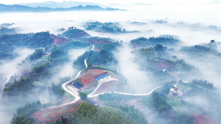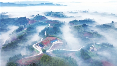 四川省泸州市纳溪区大渡口镇凤凰湖村晨雾弥漫,宛若仙境(1月19日摄,无人机照片)。