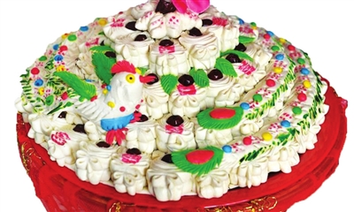 “五牲”捏好了,还要捏一个“枣山”,就是把和好的面擀成一个个一寸左右宽、二寸左右长的面片,每一个面片卷一个枣,然后再将卷好的枣卷一个个摞起来,最底层是九个,依次往上,每一层减一个,直至最高层为一个,当然还要捏底座和山尖。高高的枣山,就是寓意着生活长久,美满幸福。