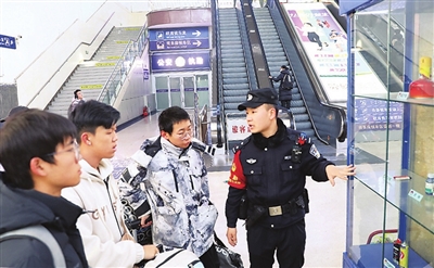 1月20日,民警向旅客讲解危险品的种类。正值春运,太原铁路公安处成立青年民警志愿者服务队,向旅客宣传出行安全常识,为旅客提供帮助。同时加大检查力度,严防危险物品进站上车。 齐向真 李岩 摄影报道