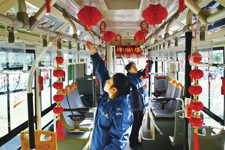 为营造浓厚的蛇年新春氛围,给乘客带来温馨舒适、年味十足的乘车体验,1月21日,830路公交车司机任磊为公交车换上“新年装”,打造“平安出行 喜迎新春”主题车厢。 齐向真 摄