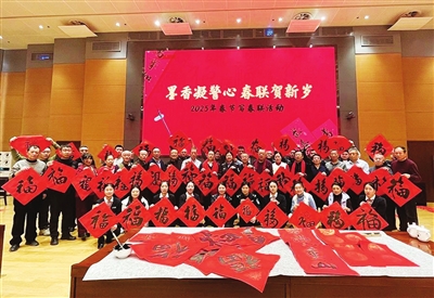 1月21日,市公安局邀请多位省市书法名家和警营书法爱好者,组织开展“墨香凝警心 春联贺新岁”2025年春节写春联活动,进一步弘扬中华优秀传统文化,营造浓厚节日氛围。受邀书法家挥毫泼墨、妙句成双,笔锋游走间,一张张红红火火的“福”字、一副副吉祥喜庆的春联,传递着对公安民警的真挚祝福和美好祝愿。 杨沫 霜红 摄影报道