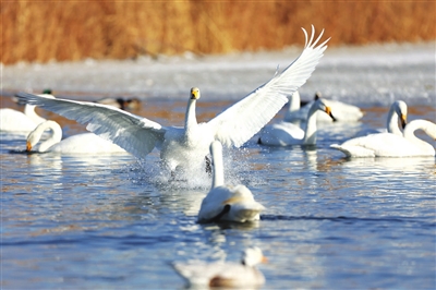 近日,甘肃省张掖市国家湿地公园迎来大批越冬的大天鹅在此栖息、觅食,灵动的身影为冬日的湿地增添了生机。近年来,张掖市不断加大生态保护力度,湿地生态得到持续改善,每年吸引大批候鸟来此越冬。