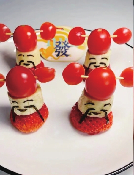 4.海苔片剪出微笑的眼睛和长胡须,将其粘贴在香蕉上。一个可爱的财神爷就做好啦!